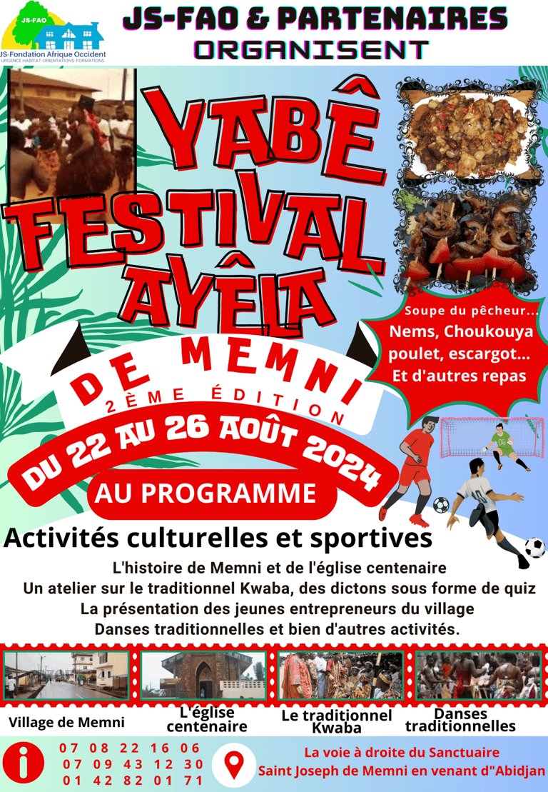 Bienvenue à la deuxième édition du « YABÊ FESTIVAL AYÊLA DE MEMNI », un événement que nous avons tous attendu avec impatience dans le cadre des fêtes Générations 2024. C'est avec une immense joie et une grande fierté que nous ouvrons aujourd'hui ce festival de grillades, un véritable hommage à notre culture, à notre communauté, et à notre vision d’un avenir durable et harmonieux. Le « YABÊ FESTIVAL AYÊLA DE MEMNI » n’est pas seulement un moment de réjouissance et de convivialité, mais il incarne également notre engagement pour la promotion du vivre ensemble et du développement durable. Tout au long de ces festivités, nous aurons l'occasion de découvrir et célébrer ce qui fait la richesse de notre village. Voici ce que vous pouvez attendre de ces quatre jours riches en activités : L’histoire de Memni : Nous plongerons dans les racines profondes de notre communauté pour redécouvrir notre patrimoine et renforcer notre sentiment d’appartenance. L’Église Centenaire : Un hommage sera rendu à cet édifice emblématique, témoin de notre foi et de notre histoire collective. Un atelier traditionnel sur le kwaba : Une occasion unique d'apprendre et de partager les secrets de cette pratique ancestrale, symbole de notre culture. Des dictons sous forme de quiz : Un moment ludique pour tester nos connaissances sur les sagesses populaires et renforcer notre lien avec les traditions locales. Des présentations de jeunes handicapé-e-s entrepreneur-e-s : Nous mettrons en lumière l'innovation et l'entrepreneuriat local, en soutenant nos jeunes talents et en les encourageant à poursuivre leurs rêves. Des danses traditionnelles : Nous célébrerons notre patrimoine à travers des performances vibrantes, qui nous rappellent la beauté et la diversité de nos traditions. Un tournoi de football maracana : Le sport, vecteur de solidarité et de cohésion, nous rassemblera autour de moments de compétition amicale et de plaisir partagé. Un concours de danse urbaine : Un moment de divertissement où chacun pourra exprimer son talent et sa créativité, tout en célébrant notre culture à travers la danse. Ce festival est le fruit d’un travail collectif, d’une passion commune et d’une volonté de promouvoir l’harmonie et le développement durable au sein de notre village. Nous tenons à exprimer notre gratitude à tous ceux qui ont contribué à l’organisation de cet événement, ainsi qu’à nos sponsors et partenaires pour leur soutien indéfectible. En participant au « YABÊ FESTIVAL AYÊLA DE MEMNI », vous contribuez à un projet plus grand que nous, un projet qui vise à renforcer notre communauté et à préparer un avenir meilleur pour les générations futures. Nous vous invitons donc à profiter pleinement de ces festivités, à participer avec enthousiasme à toutes les activités proposées, et à faire de ce festival un moment mémorable de partage, de joie et de solidarité.